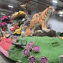 Participating in the Rose Parade began in 1980 at a cost of $35,000 sponsored and funded by 7 Southern California Rotary Districts for the purpose of communication to all "Service above Self". The 2026 float, with a budget of $165,655, included giraffes, zebras, flamingos, a hippo, a toucan, Tiger Mom with two cubs, a green snake - symbolism of animals (and people) working together in harmony in nature or the world - surrounded by thousands of flowers.